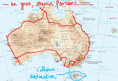 - la journée "PayDay". Et oui, c'est possible, après 11 mois de glandouille, Bridget fait enfin rentrer un peu d'argent. Il était temps! Et comme l'argent c'est fait pour être dépensé ("elle ferait mieux d'épargner quand même!"), j'ai acheté mes billets pour... la Tasmanie qui sera la dernière étape de mon aventure. Du 20 octobre au 5 novembre. Oui tu as bien compris, je passerai ma dernière soirée en Tasmanie, avec le diable! Mouhahahahahahahaha!!!!!!!